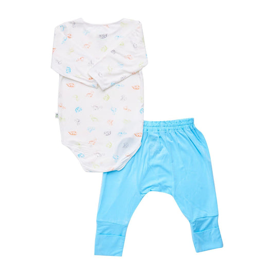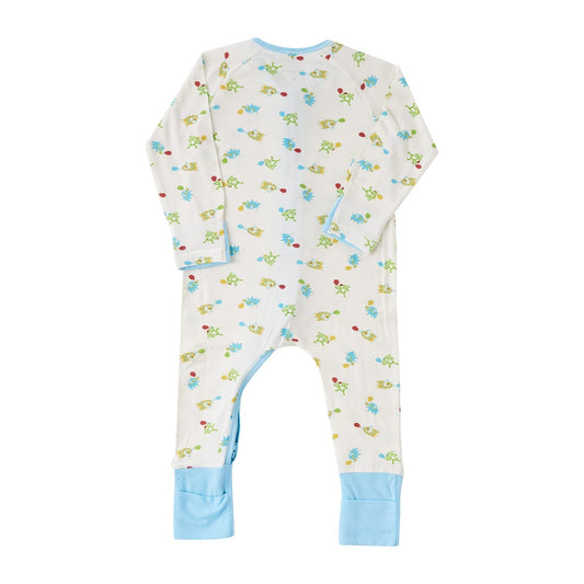 Dinosaurs - Long-sleeved Stretchy Romper with Foldable Footie Pants (Turquoise)